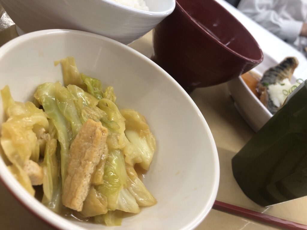 サバ本体も十分な大きさがあり、おろし煮 というだけあってさっぱりとした味付けで美味しかったです。より想像していただける表現としては、よくポン酢の宣伝でやっているさっぱり煮のような味だと思います。日替わり定食系で楽しみなのは小鉢料理です。道庁 地下食堂の定食は3種類の小鉢の中から好きなのを1つ選べます。それも野菜がより多く取れそうなキャベツ炒風小鉢にしてみました。何と言っても630円なので色々文句は言えませんが。これでメインの鯖のおろし煮 がもう少し暖かかったら完璧です。